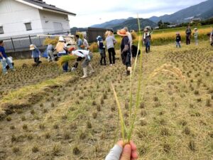 稲刈りの後半は、「暇な人は落ち穂拾いして!」と繰り返し指示があり、私は別用で遅刻したけど少しお手伝いができました。