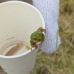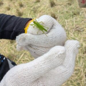 子ども達は生き物探しにも夢中!カエルが無数にいるし、↓↓ 写真は子供の手のうえに、たぶんキリギリスです🦗 「稲刈り体験」は半分以上、生き物探しが魅力なんじゃないかな。